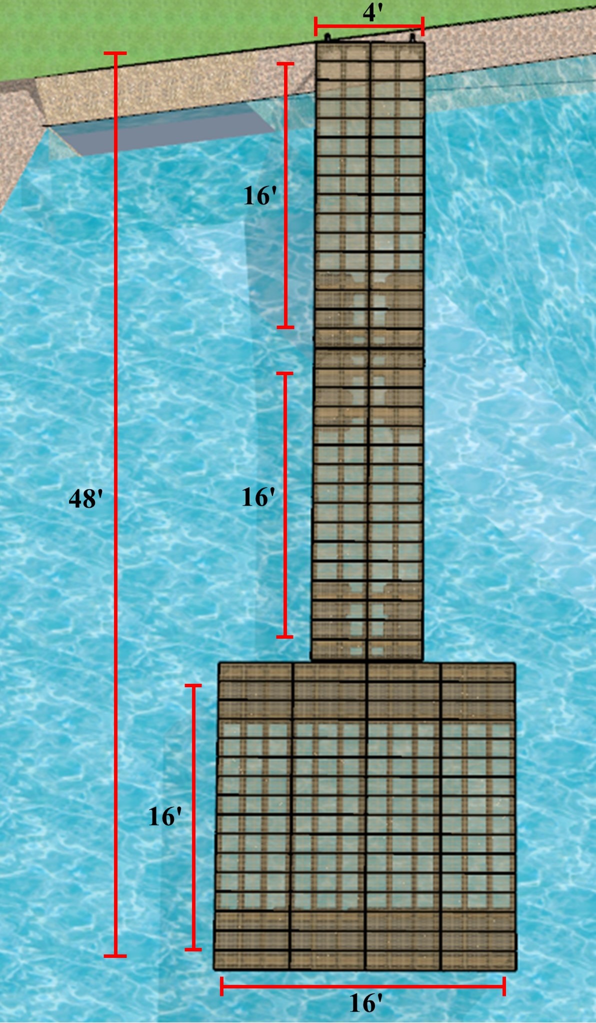 Take advantage of our complete dock package including a 6'x16' semi-floating dock, a 6'x16' floating dock and a 16'x16' floating dock.
